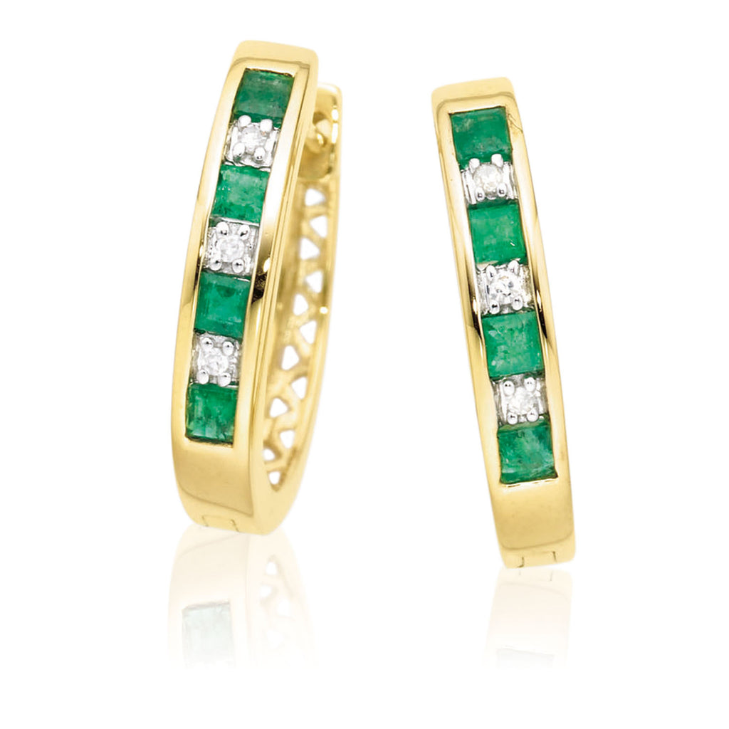 Elegantly crafted in 9ct Yellow Gold, gorgeous Square cut natural emeralds make the perfect fusion with stunning Square cut diamonds in these easy to wear huggies. Also available in ruby and sapphire.