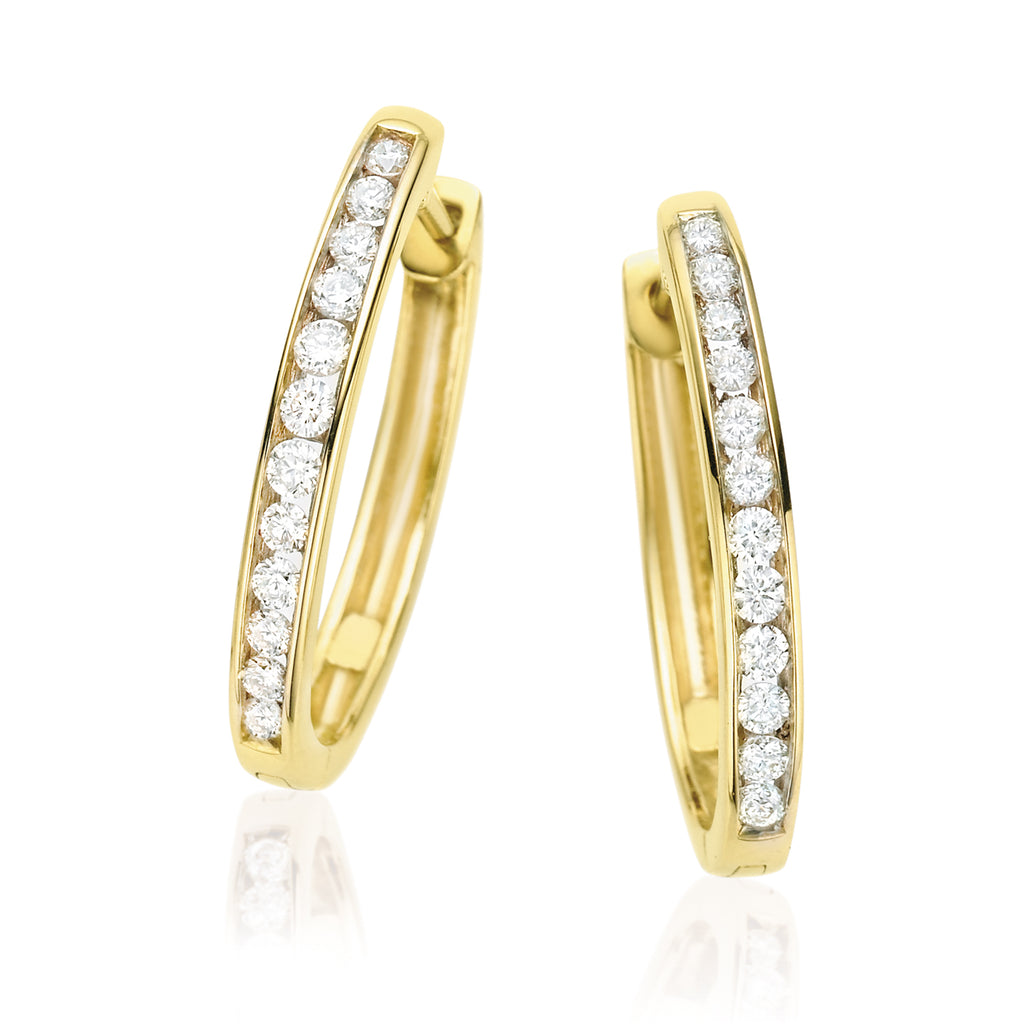 Crafted in 9ct Yellow Gold, these classic huggies feature channel set, round brilliant cut diamonds that secure comfortably with hinged backs. Also available in White Gold.
