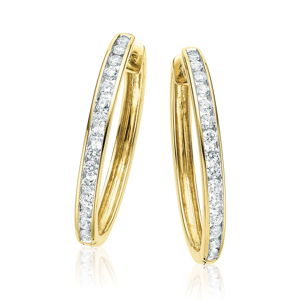 Crafted in 9ct Yellow Gold, these classic huggies feature channel set, round brilliant cut diamonds that secure comfortably with hinged backs. Also available in White Gold.