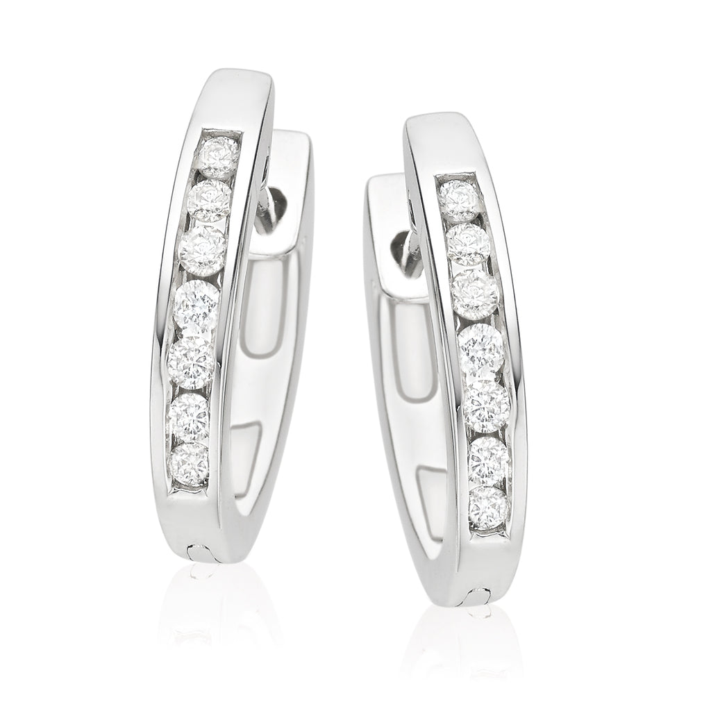 Crafted in 9ct White Gold, these classic huggies feature channel set, round brilliant cut diamonds that secure comfortably with hinged backs. Also available in Yellow Gold.