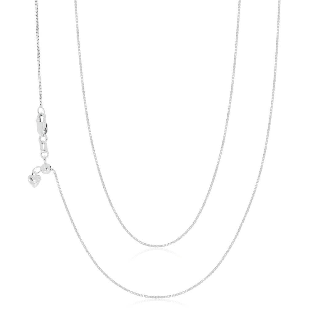 This 9ct White Gold 45-50cm adjustable box chain is an elegant wardrobe essential. Wear on its own for a minimalist look, or pair with a stunning pendant.