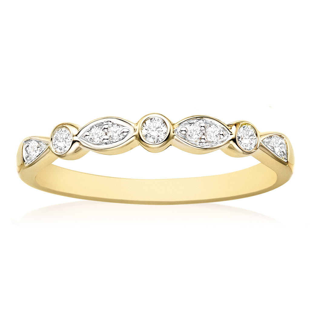 Crafted in 9ct Yellow Gold this stackable ring features marquise shaped frames set with round brilliant cut diamonds. This beautiful ring looks great stacked with others but is a stand out all on its own. Also available in White Gold.