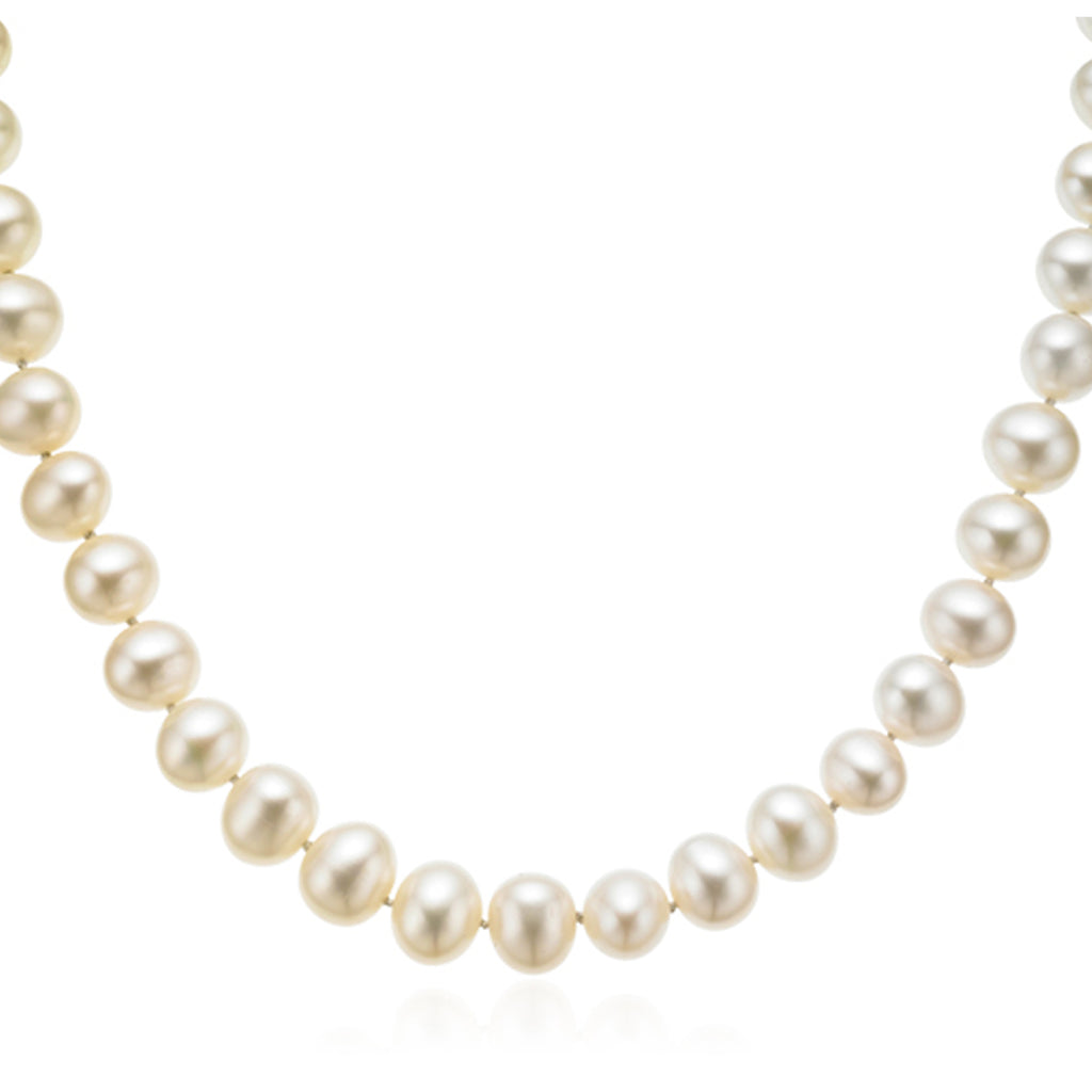 Make an elegant statement with this strand of Freshwater Pearls. Crafted with a 14ct Yellow Gold clasp, this strand features 9-10mm cultured white Freshwater Pearls.