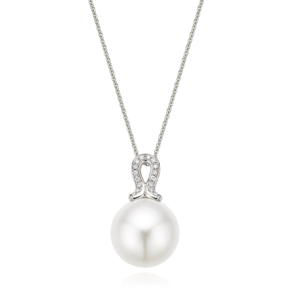 An iconic 13mm South Sea Pearl from pristine waters, is beautifully suspended by a fancy diamond set 18ct White Gold bail. Pair with diamond or pearl earrings for a stylish look.