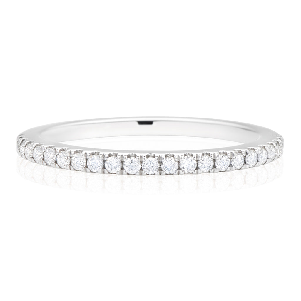 From the Vera Wang Love Collection, this captivating 18ct white gold anniversary band offers incomparable beauty and unmatched quality. Prong-set into a ribbon of gold, 0.23 Carat tw of shimmering round diamonds encircle this classic anniversary band. Two round-cut blue sapphires, the signature of the collection and a symbol of faithfulness and everlasting love, are set into the ring's shank at the top and bottom. Lovely alone, this band was designed to complement most Vera Wang engagement rings. Buffed to a brilliant shine, this timeless design is a dazzling symbol of your love and commitment.