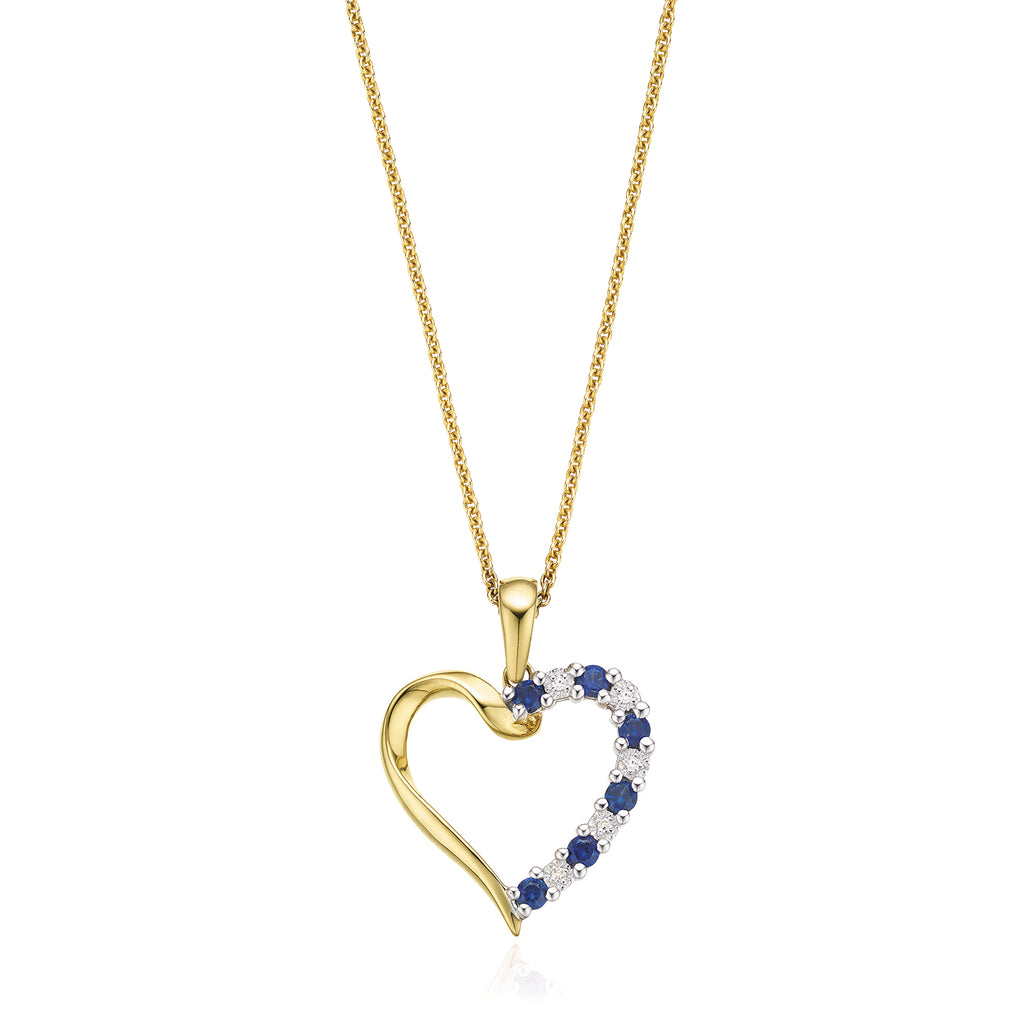 A simple design yet stunning presentation, this sweet open heart-shaped pendant is adorned with six natural round brilliant cut sapphires set between round brilliant cut diamonds. Set in 9ct Yellow Gold, this piece makes a thoughtful gift for a special person. Also available in ruby and emerald.