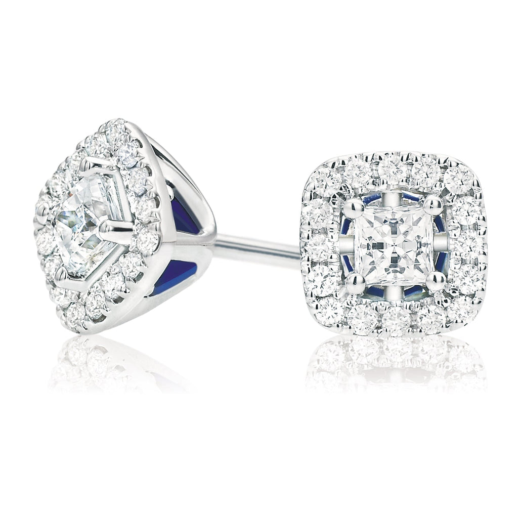 Treat her to a sweet surprise with these dramatic diamond stud earrings from the Vera Wang Love Collection. Crafted in cool 18ct white gold, each earring features a shimmering princess-cut diamond wrapped in a cushion-shaped frame of sparkling round diamonds. A blue sapphire, the signature of the collection and a symbol of faithfulness and everlasting love, hides within each earring setting.