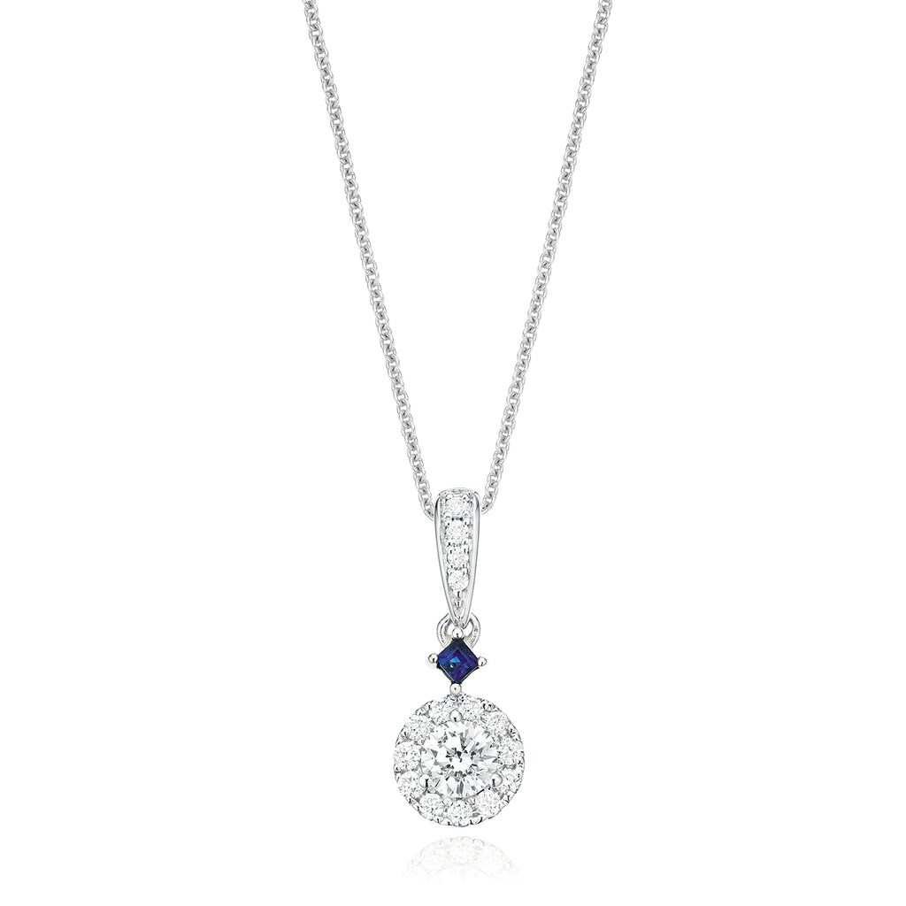 Designed to dazzle, this stunning gemstone and diamond necklace from the Vera Wang Love Collection is certain to be adored. Crafted in 18ct white gold, this drop design features a round-cut diamond wrapped in a halo frame of shimmering diamonds set below a princess cut Blue Sapphire and diamond set bail.