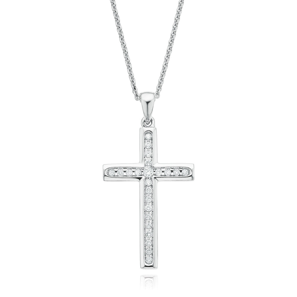 This sleek and simple cross is crafted in 9ct White Gold and set with sparkling round brilliant cut diamonds. Polished to a bright shine, this meaningful cross suspends from a polished bail. Also available in 9ct Yellow Gold.