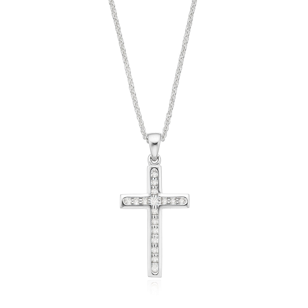 This sleek and simple cross is crafted 9ct White Gold and set with sparkling round brilliant cut diamonds. Polished to a bright shine, this meaningful cross suspends from a polished bail. Also available in 9ct Yellow Gold.