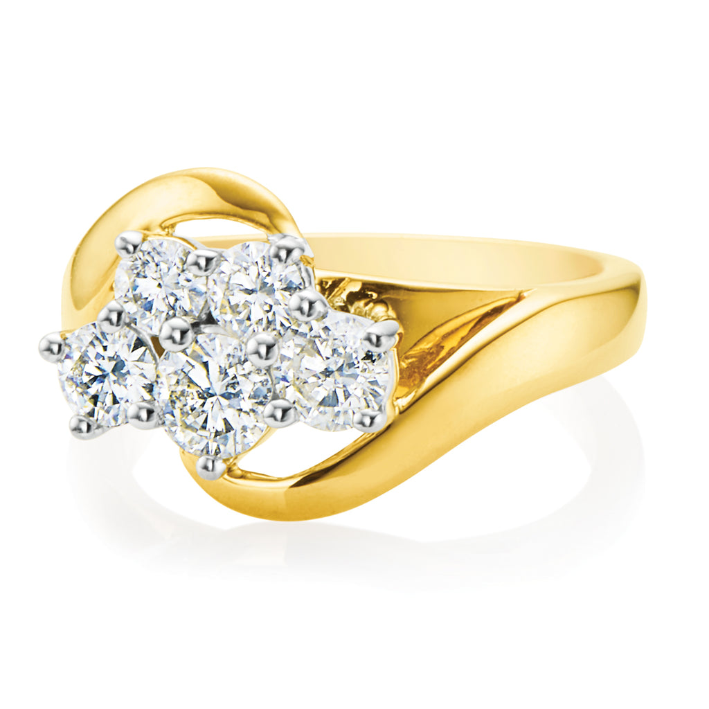 An impressive 1 carat tw ring with a twist. The 18ct Yellow Gold polished band, gently sweeps around five round brilliant cut diamonds creating a striking look.