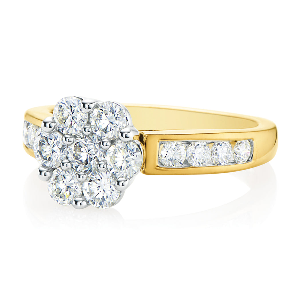 This beautiful 18ct Yellow Gold ring is certain to delight with seven round brilliant cut diamonds forming a flower shape cluster. Channel set diamonds line the shoulders for a total of 1 Carat.