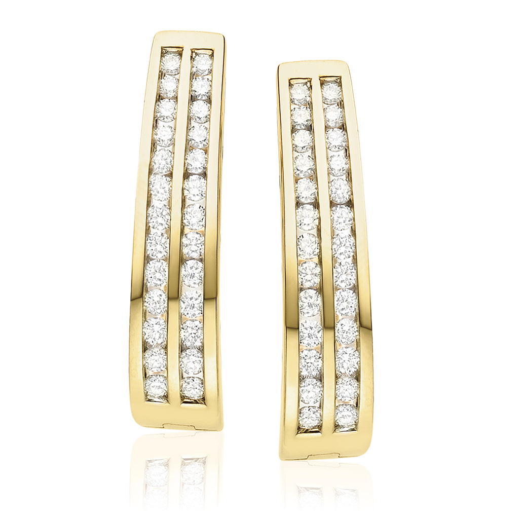 Classic and elegant. These diamond huggies have been carefully crafted in 9ct Yellow Gold. Each oval shaped hoop features a double row of channel set, round brilliant cut diamonds. Adding a touch of sparkle with a 1 Carat tw of diamonds. Secured comfortably with hinged backs.