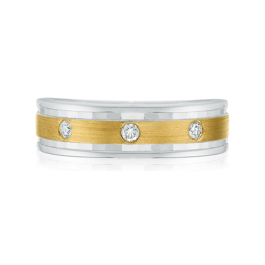Go for a look that is a little less than ordinary with this two tone diamond set men's wedding ring. Featuring a trio of round brilliant cut diamonds in a rub-over setting, the mixed finish design includes brushed 9ct Yellow Gold on the inner band and classic polished Sterling Silver on the outer edges.