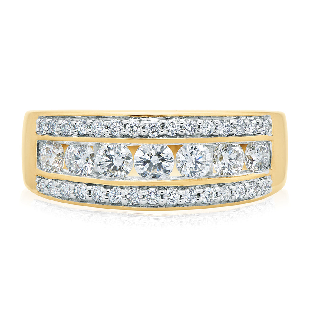 With layers of sparkle, this 18ct Yellow Gold ring features a centre row of channel set round brilliant cut diamonds outlined by rows of claw set diamonds.