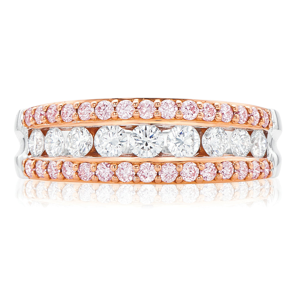 Simple but elegant, this diamond ring from our exclusive Pink Diamonds collection is sure to impress. This unique style features a row of round brilliant cut, white diamonds that are enhanced with a row of natural pink diamonds on either side.