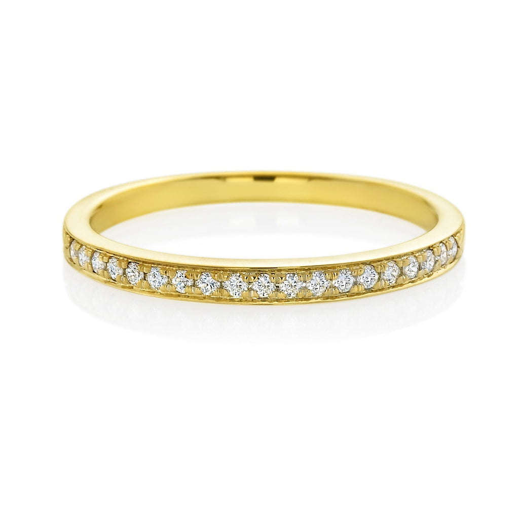 Timeless and understated, this 0.13 Carat tw Diamond wedding ring features a band made from 18ct Yellow Gold and beautiful Round, Brilliant Cut diamonds.