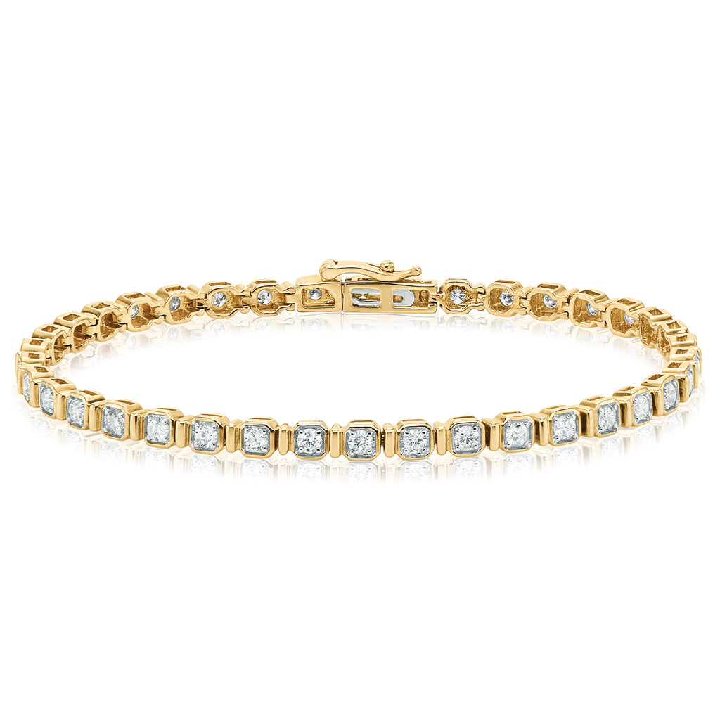 This modern take on a classic tennis bracelet will capture everyone’s attention. 2 Carat tw of round brilliant cut diamonds are claw set into 9ct Yellow Gold squares.