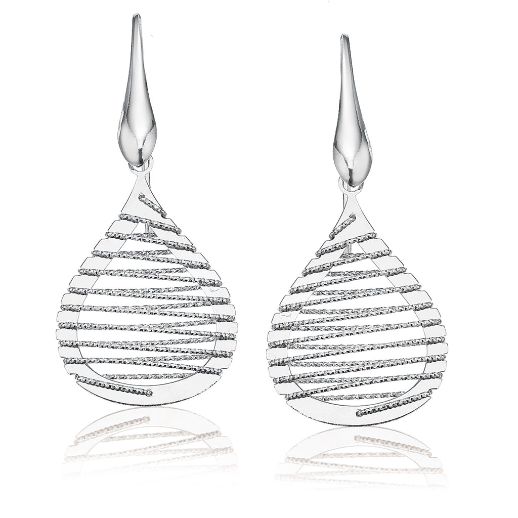 These intriguing Sterling Silver drop earrings each feature a glistening tear drop shaped outline skilfully wrapped with a diamond cut Sterling Silver wire overlay. These modern earrings secure with Sheppard's hooks.