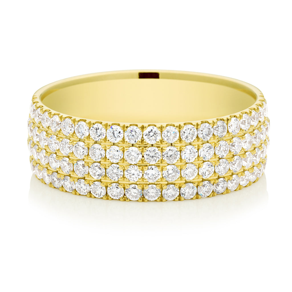 A true show stopper this diamond ring set in 18ct Yellow Gold features four rows of Pave diamonds. The captivating 1 Carat tw of diamonds makes it the perfect stand out design.