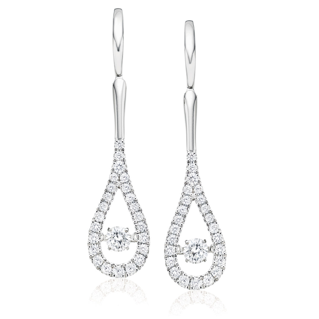 These dancing diamond drop earrings crafted in 18ct White Gold enchant with 0.90 Carat tw of diamonds. At the centre of a teardrop, a round brilliant cut diamond shimmers in this unique setting. Beautifully paired with the matching pendant.
