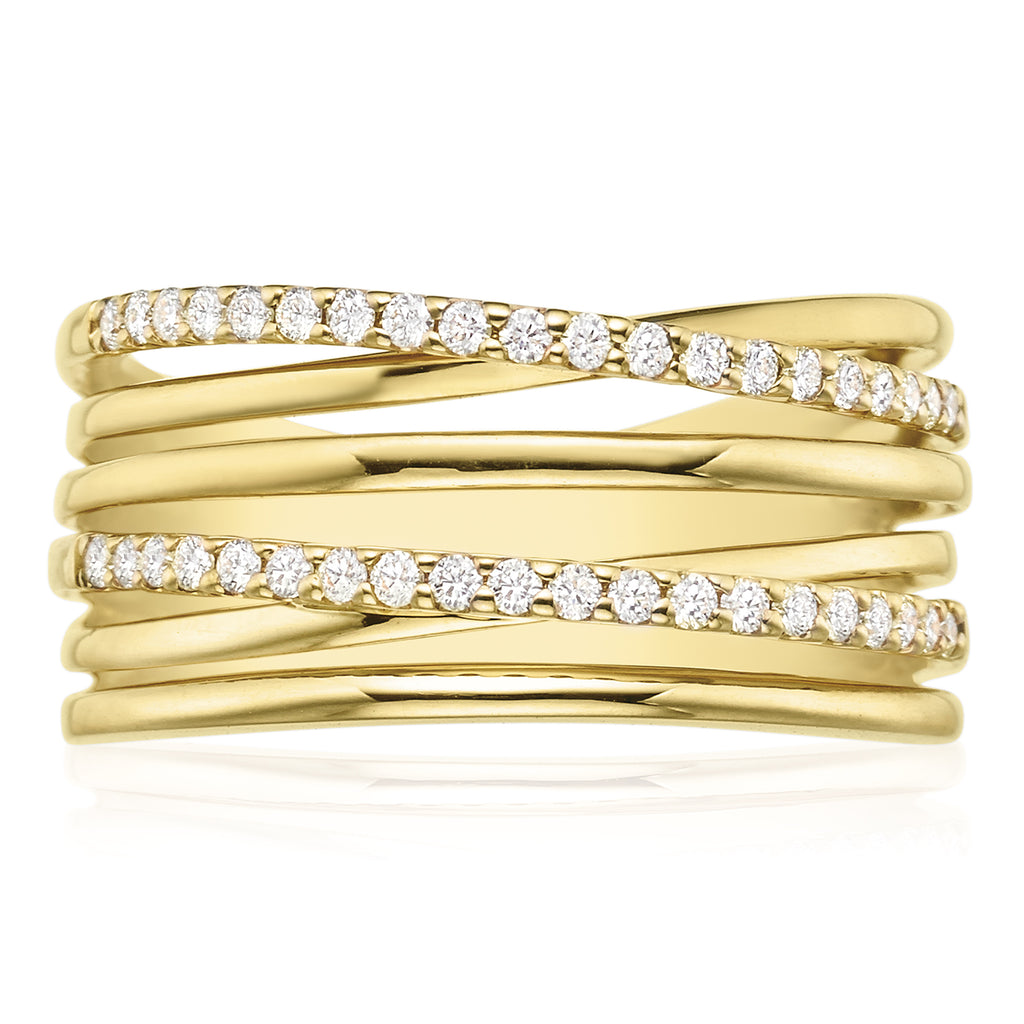 This crossover ring is the perfect accessory. Two separate rows of round brilliant cut diamonds set in 9ct Yellow Gold, cross over four polished bands creating a contemporary look.