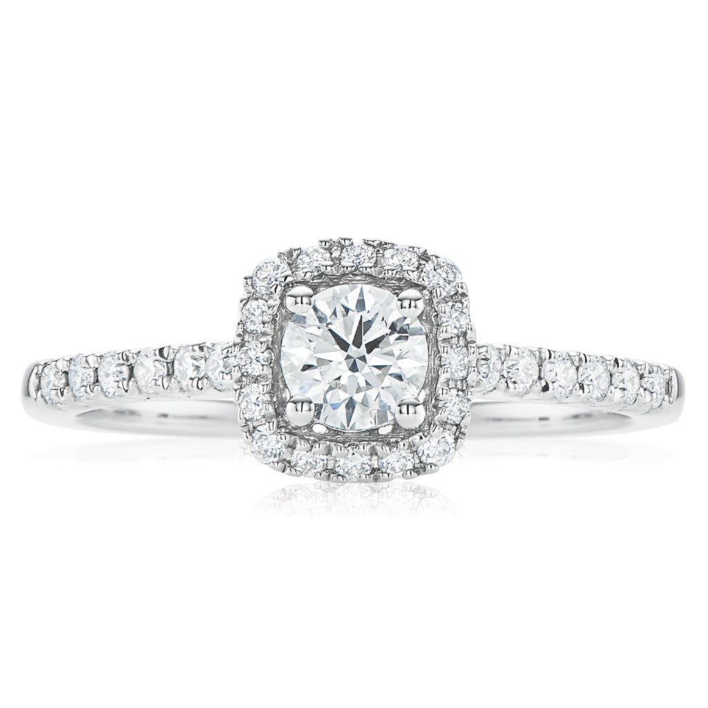 Our Halo Collection brings together classic, elegant and modern designs. This 18ct White Gold Halo engagement ring features a 1/3 Carat GIA certified round brilliant cut diamond set with a cushion look and enhanced with claw set diamond shoulders.