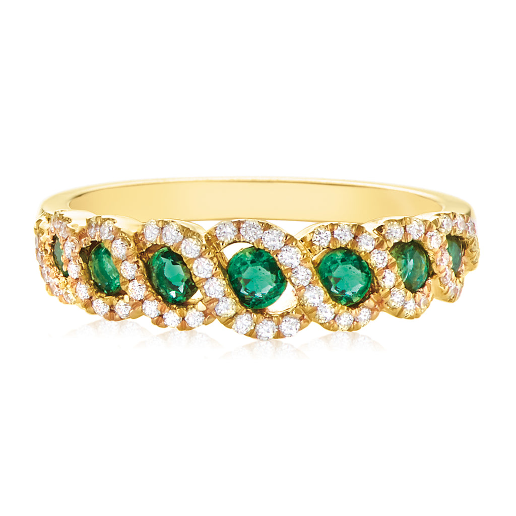 Seven precious natural round brilliant cut emeralds set in 18ct Yellow Gold are surrounded by 1/4 Carat tw of diamonds. A perfect ring for any occasion, also available in sapphire and ruby.