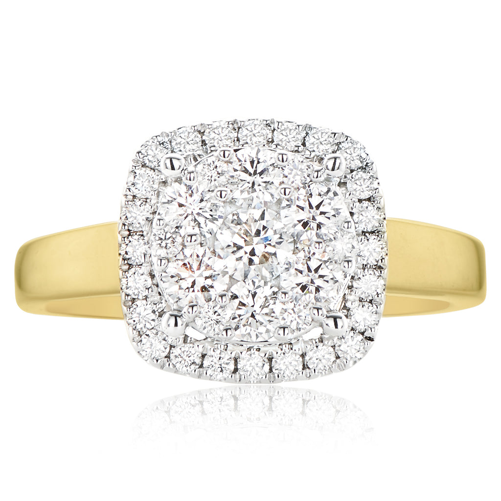 This impressive 1 carat tw of diamonds ring features a cluster of round cut diamonds at the centre, surrounded by a halo of smaller diamonds for added captivation. Make her fall in love all over again with this spectacular ring.