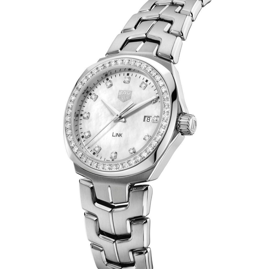 A scintillating diamond edition (0.792 CT) of the Link Lady Quartz with a very feminine dial in luminous white mother of pearl. Feminine glamour, quartz-powered reliability and steel strength: the ideal watch for active women seeking style.
