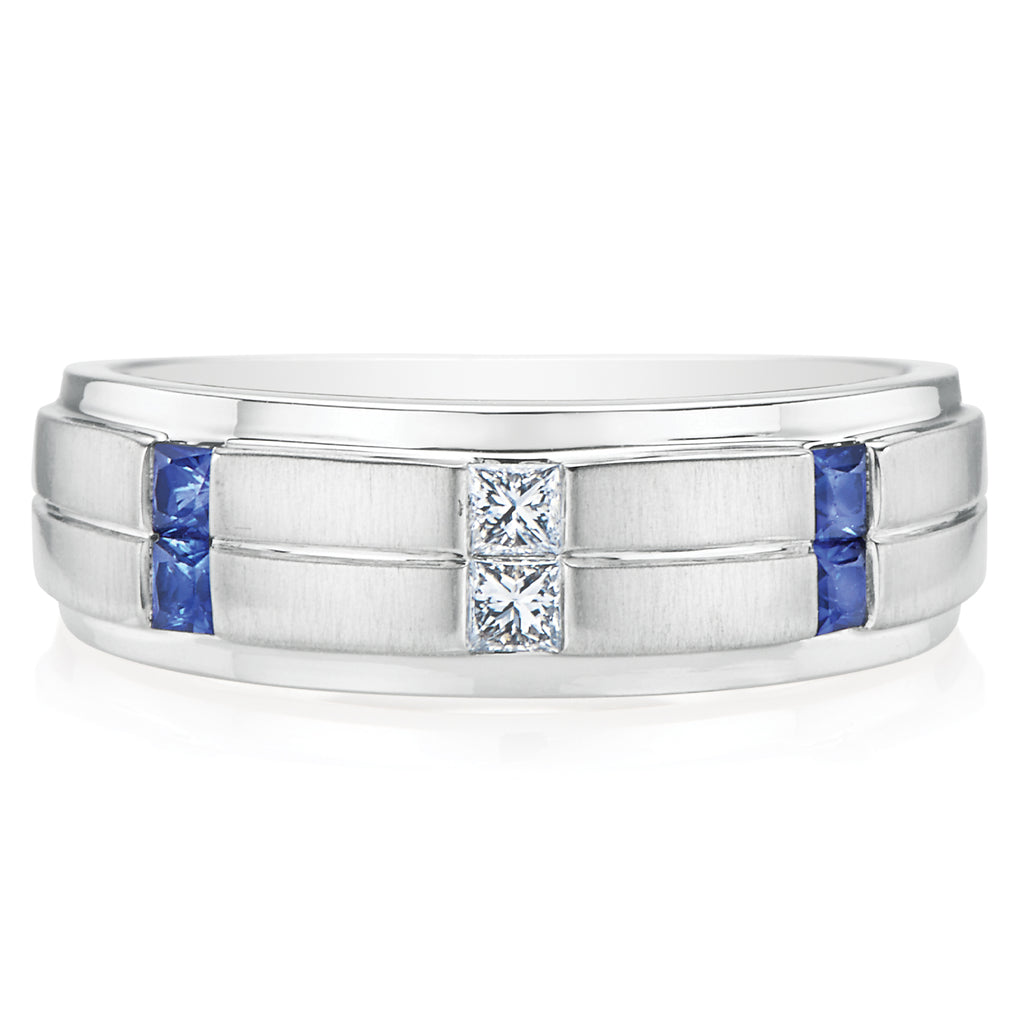 Celebrate your loving commitment and his sophisticated style with this diamond and sapphire wedding band from the Vera Wang Love Collection. Expertly crafted in satin-finished 14ct white gold, this handsome wedding ring features two striking channel-set diamonds set one atop the other at the centre of the style. Flanking either side of the diamonds, duos of princess-cut bright blue sapphires, a symbol of faithfulness and love, are the signature of the collection. Stepped edge detailing gives the ring depth and dimension. This comfort-fit wedding band is a meaningful symbol of your marriage vows.