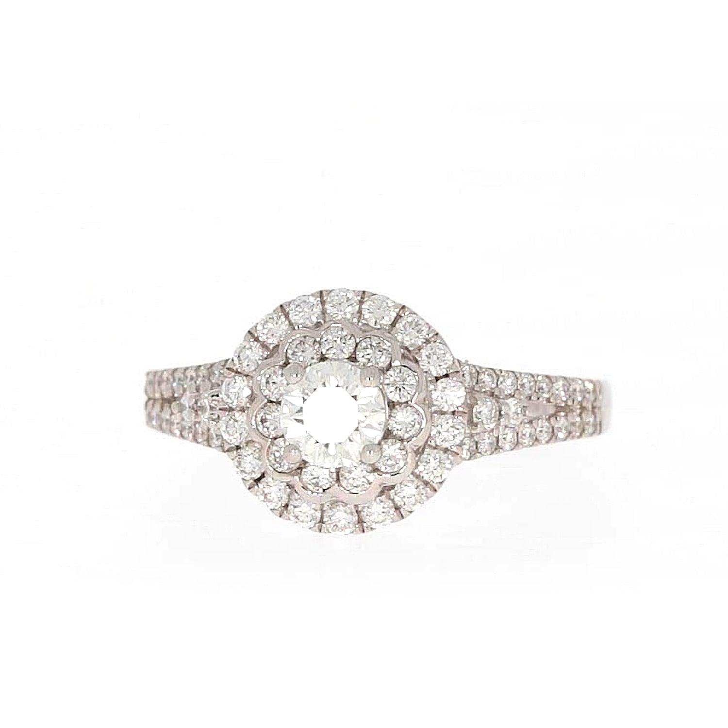 Our Halo Collection brings together classic, elegant and modern designs. This 18ct White Gold Halo engagement ring features a 0.35 Carat GIA certified round brilliant cut diamond set in a flower design halo setting, further enhanced with claw set diamond split shoulder stones.