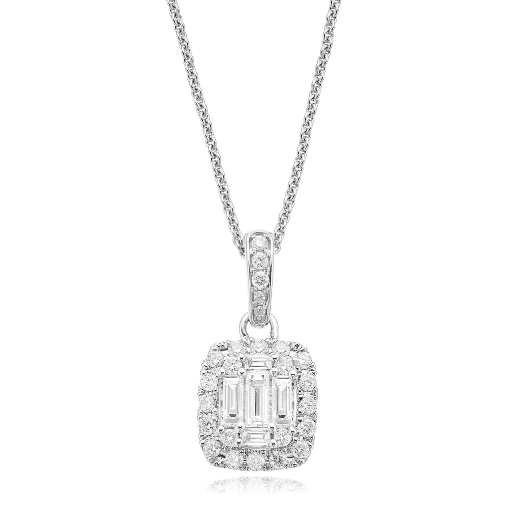 This remarkable pendant has a classic and contemporary style. Set with a combination of baguette and round brilliant diamonds. Elegantly suspended with diamond set bail, this piece features over 1/2 Carat tw of sparkling diamonds.