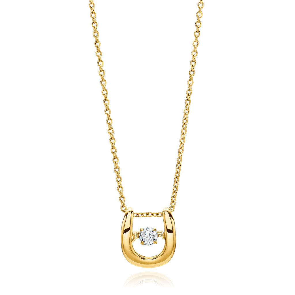 This beautiful horseshoe necklace crafted in 9ct Yellow Gold features a dancing diamond which catches and reflects light in its unique. Buffed to a brilliant lustre, this gorgeous pendant is suspended on a classic cable chain.