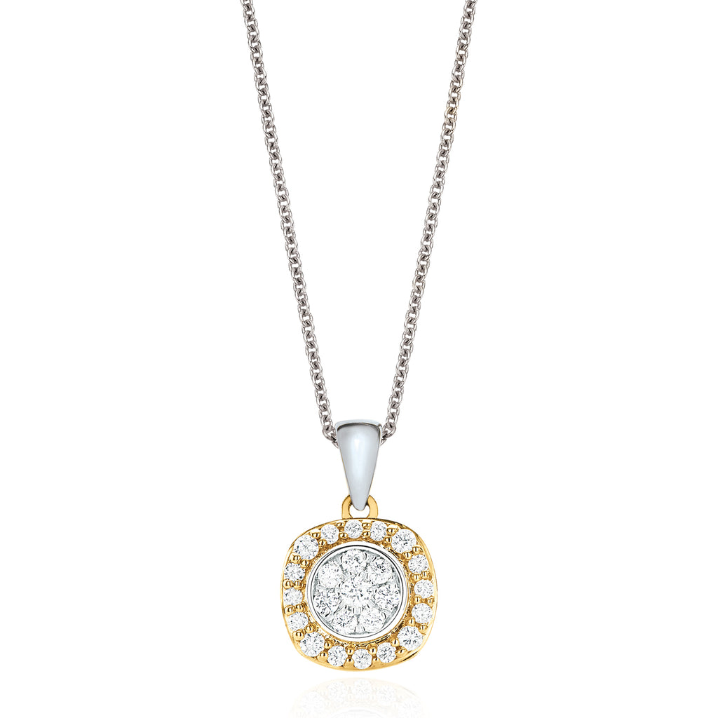 The perfect addition to any jewellery box, this two tone pendant features a cluster of diamonds surrounded by a single halo.