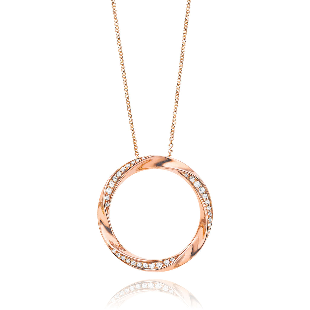This open circle diamond pendant is cleverly designed with round brilliant cut diamonds set into a three dimensional formation. The pendant is suspended on an elegant Rose Gold chain.