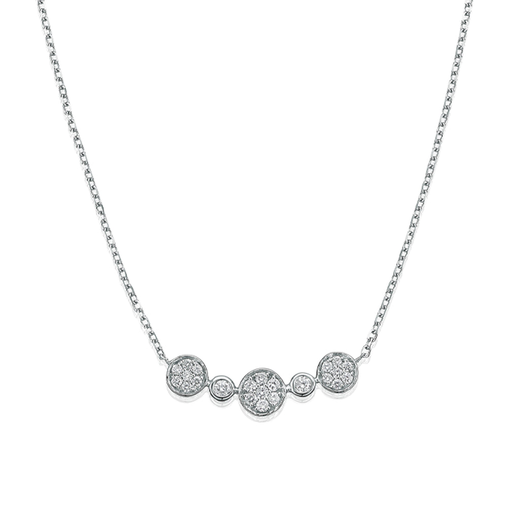 This contemporary and eye catching necklace crafted in 9ct White Gold, features three circle clusters of shimmering diamonds, alternating with single bezel set round brilliant cut diamonds. Suspended and centred along a classic cable chain, this piece is designed to sparkle.