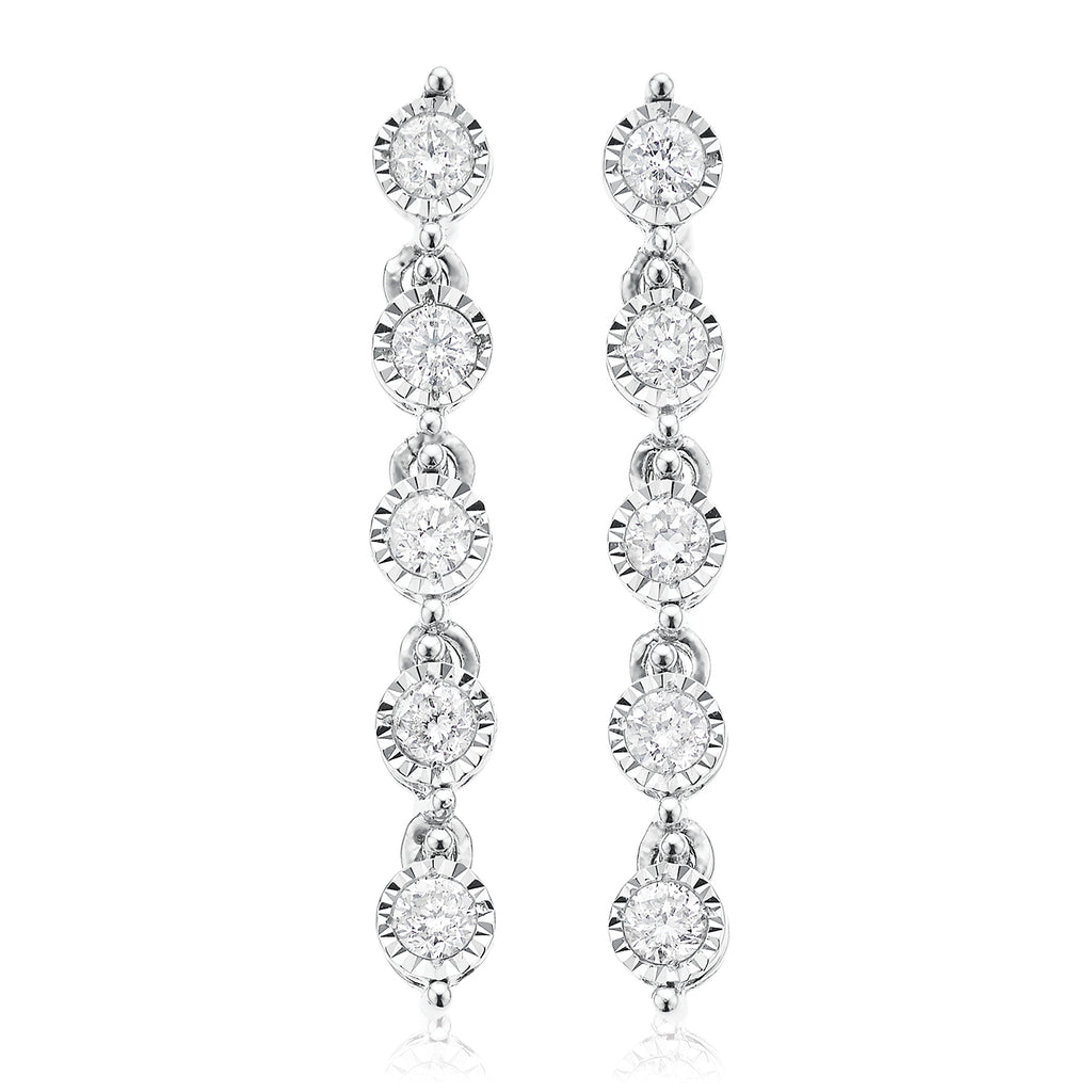 From ordinary to extraordinary, these 9ct White Gold drop earrings dazzle with a row of individual bezel set round brilliant cut diamonds. With 1/4 Carat of diamonds, these post earrings secure comfortably with butterfly backs.