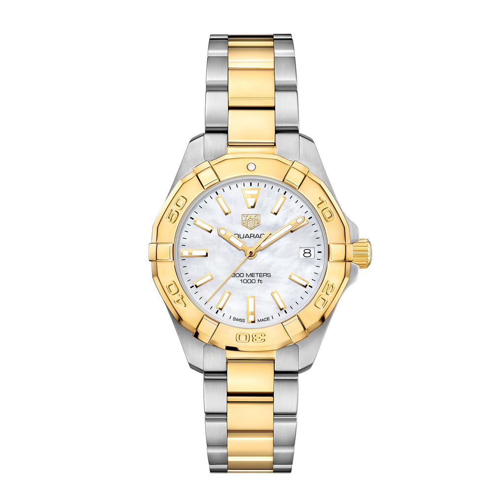 An assertive design in steel and gold, with larger 32mm case and the full features of a professional sports watch. For active women with strong personality and a love of glamour.