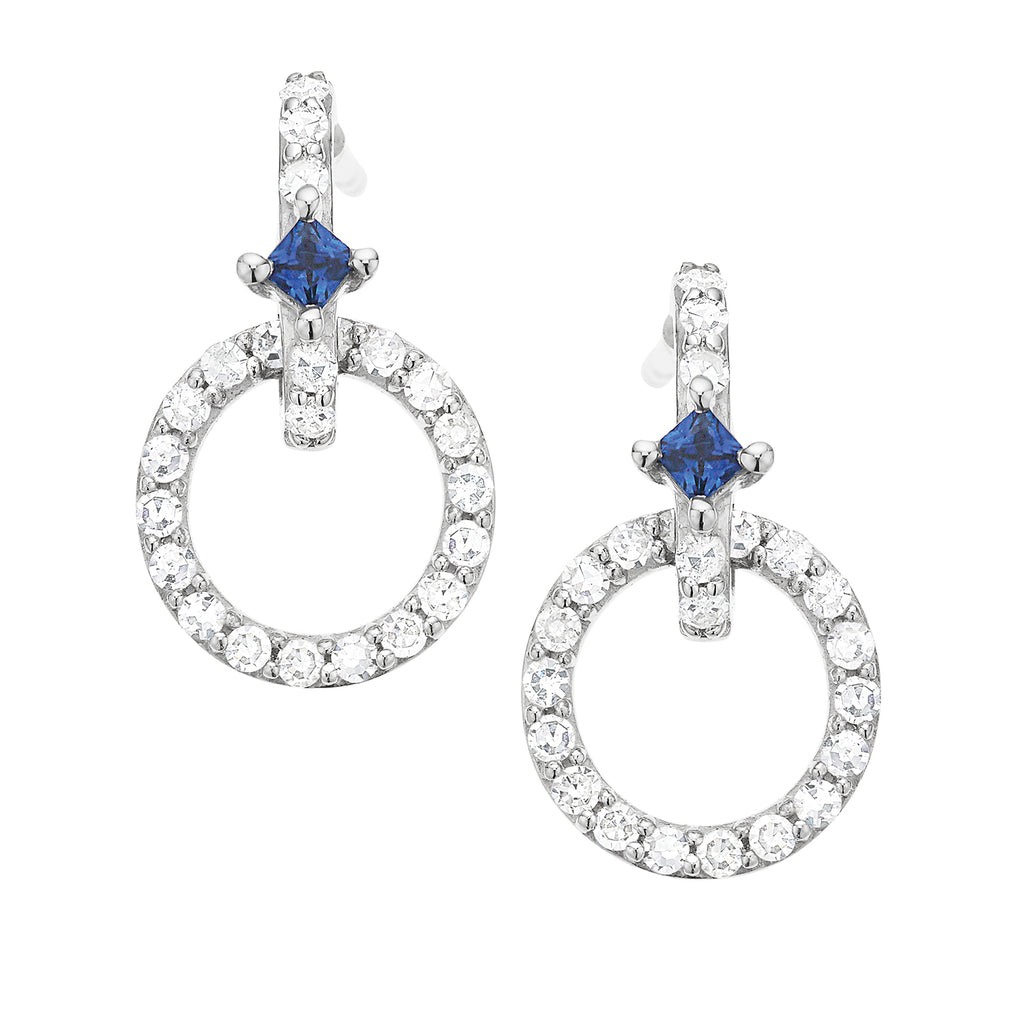 Express your affection with these shimmering gemstone and diamond drop earrings from the Vera Wang Love Collection. Crafted in sterling silver, each earring features an open diamond-lined circle dangle below a diamond-lined post drop. At the post's centre, a single princess-cut bright blue sapphire - a signature of the collection and a symbol of faithfulness and everlasting love - provides a colourful focal point.