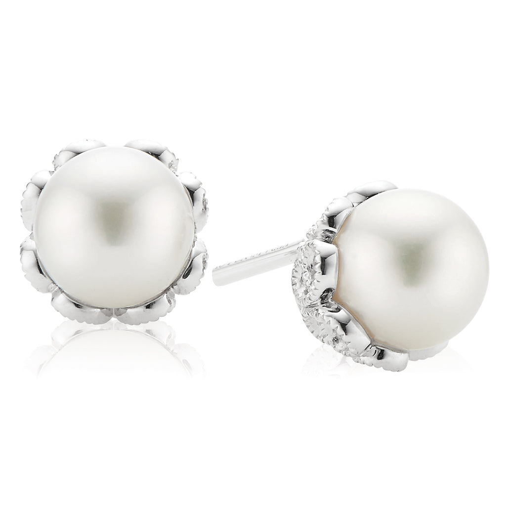 Remind her she's treasured with these gorgeous pearl earrings from the Vera Wang Love Collection. A glamorous look, this classic design features beautiful and luminous 6.5-7.0mm cultured freshwater pearls. Set behind the back of the earrings is a hidden blue sapphire - the signature of the collection and a symbol of faithfulness and everlasting love.