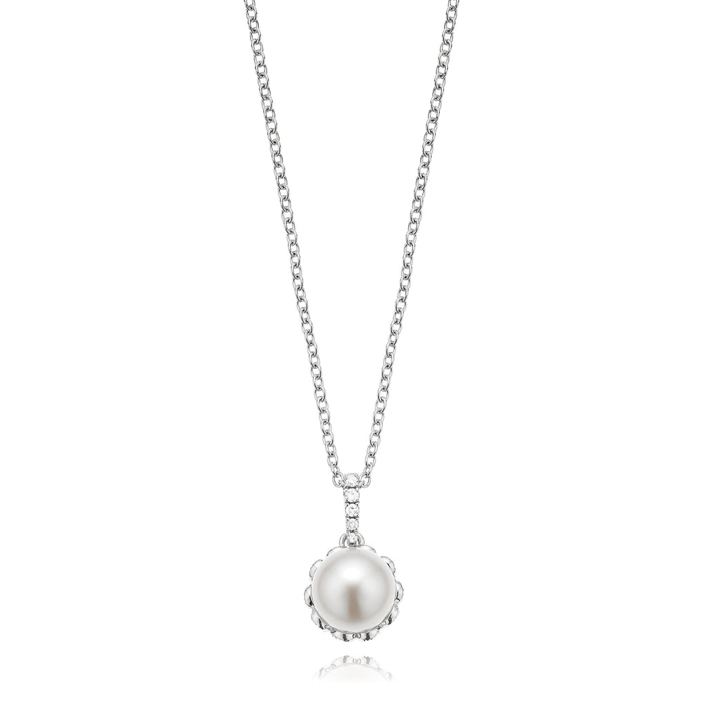 Remind her she's treasured with this gorgeous pearl necklaces from the Vera Wang Love Collection. A glamorous look, this classic design features beautiful and luminous 7.5-8.0mm cultured freshwater pearls. Set behind the back of the pendant is a hidden blue sapphire - the signature of the collection and a symbol of faithfulness and everlasting love.
