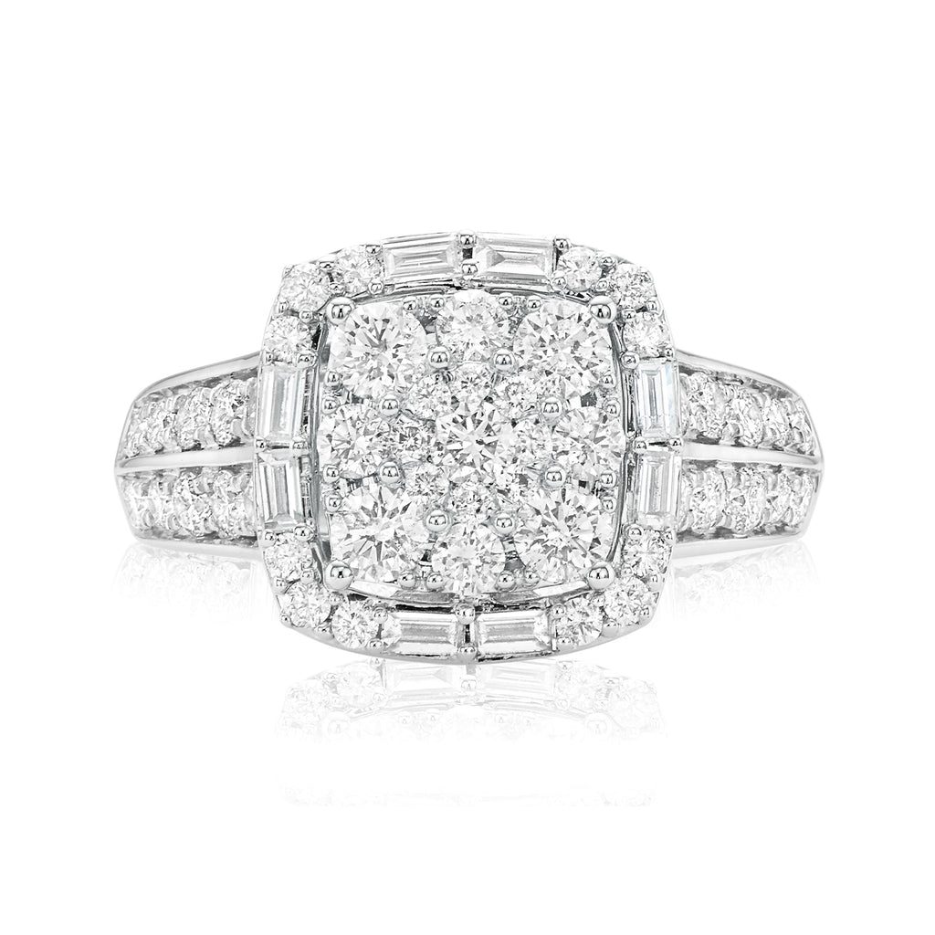 This unique ring crafted in 9ct White Gold showcases a cluster of diamonds wrapped in a frame of baguette cut and round brilliant cut diamonds. Totalling 1 1/2 Carat tw, the shoulders are lined with a double row of diamonds.