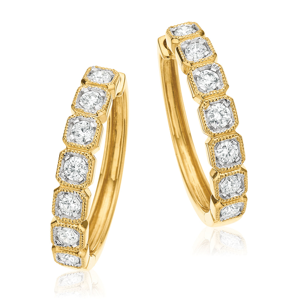 Bring sparkle to any attire with these vintage inspired diamond huggies. Crafted in 18ct Yellow Gold, this design features a linear pattern of round diamonds in milgrain detailed square frames. Radiant with 1/2 Carat tw of diamonds, the hoops secure comfortably with hinged backs.