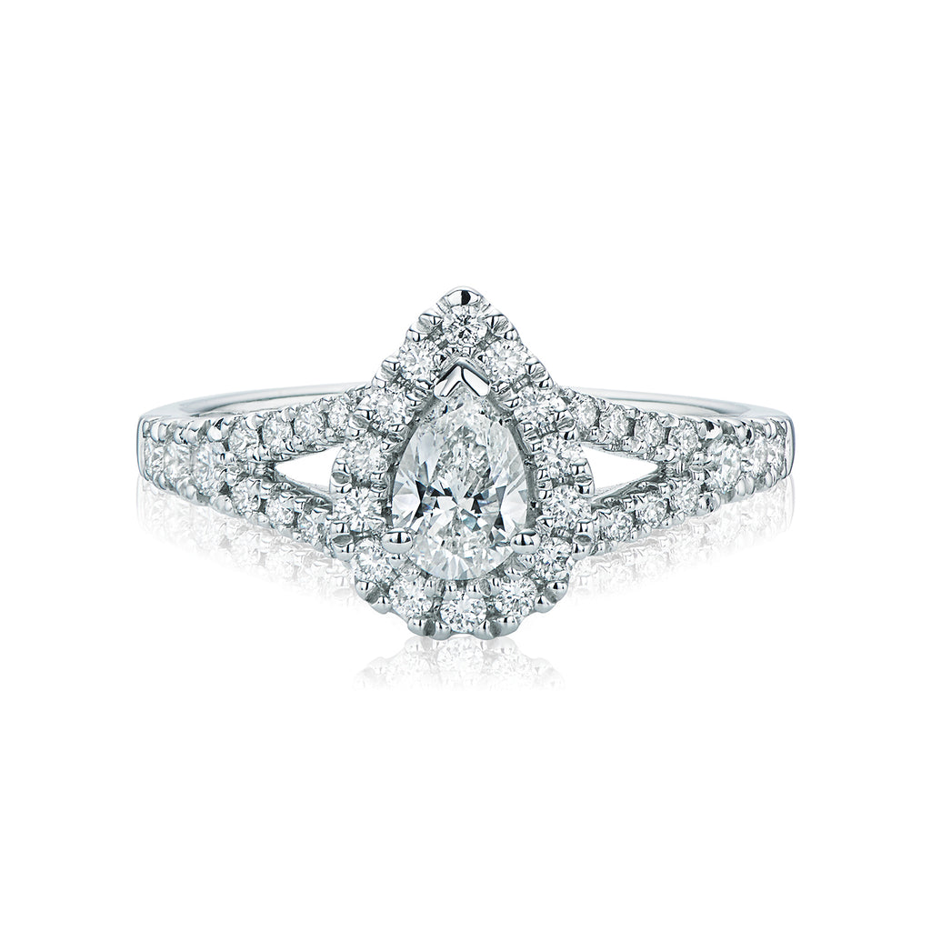 Our Halo Collection brings together classic, elegant and modern designs. This 18ct White Gold Halo engagement ring features a 1 Carat GIA certified pear cut diamond set with a classic Halo which is further enhanced with a split diamond band.
