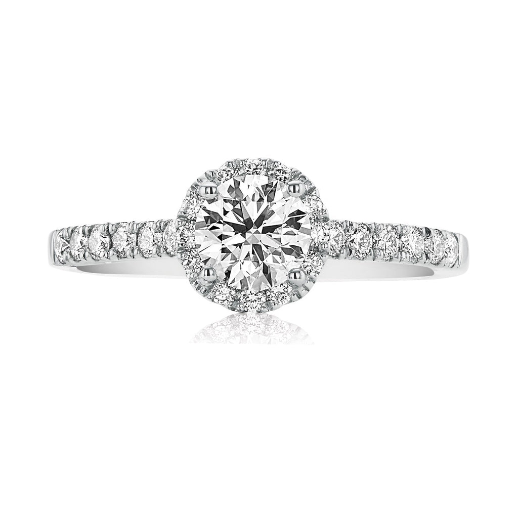 Our Halo Collection brings together classic, elegant and modern designs. This Halo engagement ring features a 0.70 Carat GIA certified round brilliant cut diamond set with a classic and modern circled Halo, crafted in 18ct White Gold.