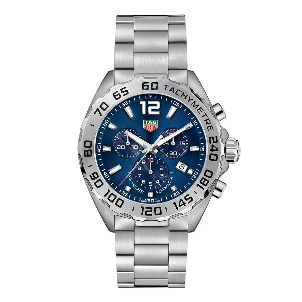 A chronograph with blue sunray-brushed dial and 3-row steel bracelet. Quartz powered for ultimate precision and water resistant to 200 meters. Ready for anything.