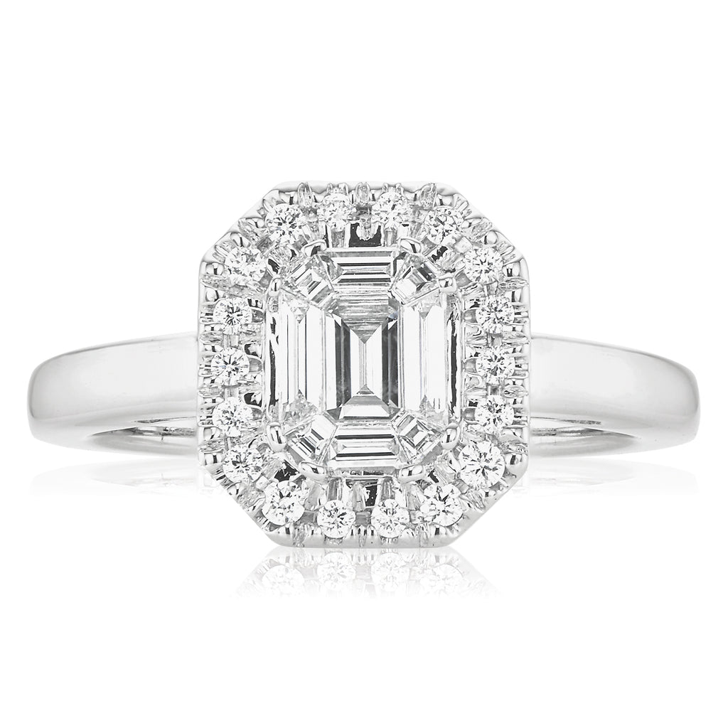 An illusion of a large Emerald diamond is enhanced by a single halo of round brilliant cut diamonds. With 1/2 Carat tw of diamonds contrasted by an 18ct White Gold polished band, this classic design will never go out of style.