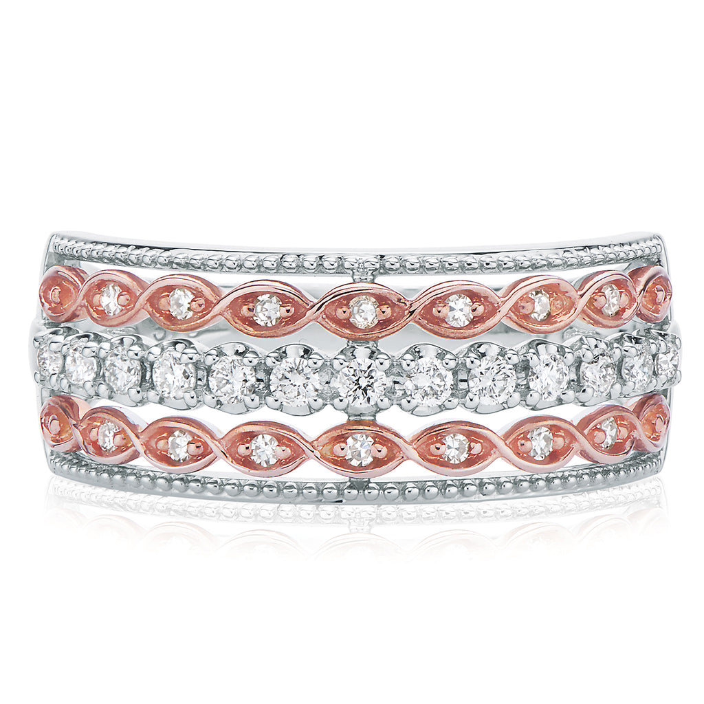 This two tone diamond dress ring is a fun choice. Crafted in9ct White and Rose Gold, this ring highlights two rows of diamonds encircled in polished Rose Gold frames with a row of claw set diamonds sparkling across the centre. Milgrain detailing lining the out edges of the piece to complete the look.