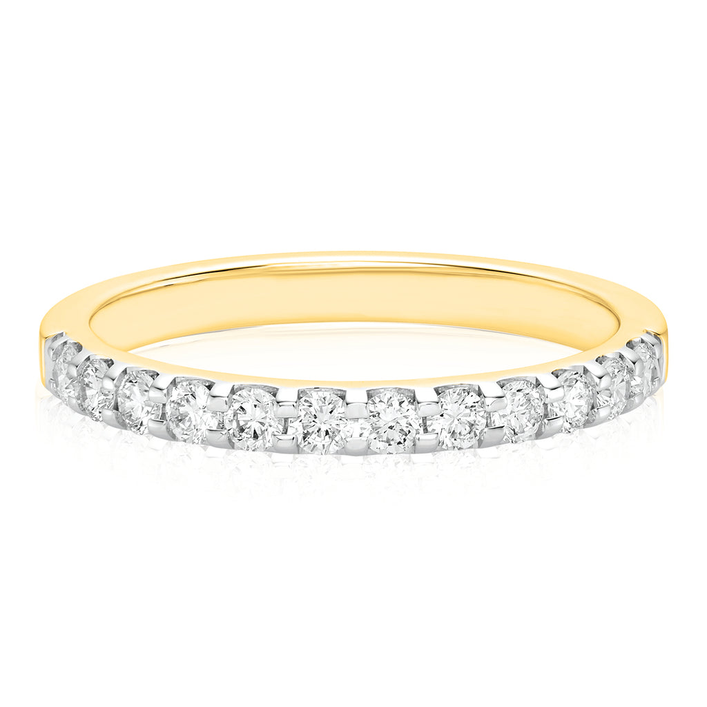 Celebrate eternal love with this Diamond Wedding Band. Featuring 1/3 Carat tw of round brilliant cut diamonds in a claw setting, finished with 18ct Yellow Gold.